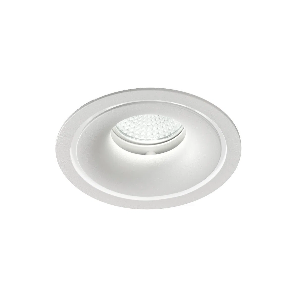 Foco embutido fijo, bisel redondo, IP44, 220V. Diámetro exterior 98mm, perforación 90mm. Acabado blanco mate. No incluye ampolleta.